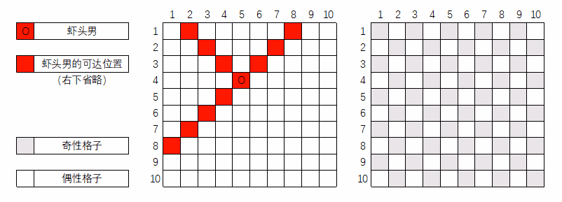 关于虾头男的控制区域(下一步能走到的格子的集),发现对于控制区域中的每个格子,奇偶性相同。这点通过公式也可得出。